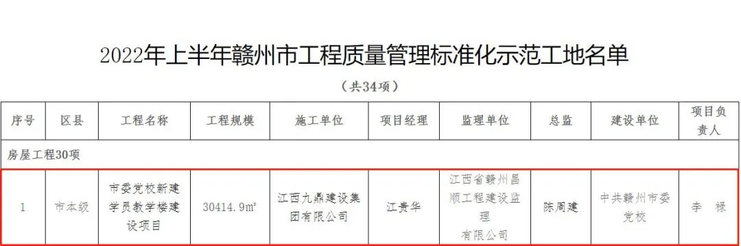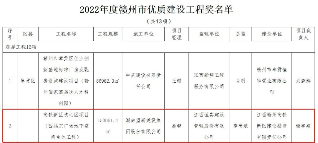 由赣州城投集团负责建设实施的高铁新区核心区项目(西站东广场地下空间主体工程)荣获赣州市优质工程奖,由集团组织实施的市委党校新建学员教学楼建设项目等4个项目荣获2022年上半年赣州市工程质量管理标准化示范工地荣誉称号。