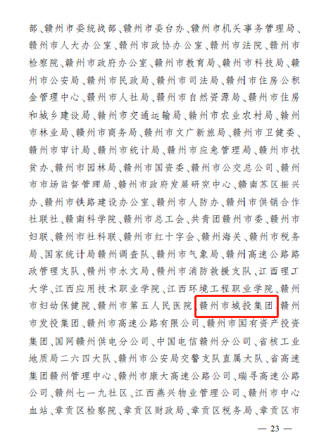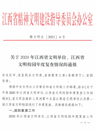 近日,江西省文明办印发《关于2020年江西省文明单位、江西省文明校园年度复查情况的通报》(赣文明办[2021]4号),赣州城投集团顺利通过2020年省级文明单位年度复查,继续保留“第十五届江西省文明单位”称号。