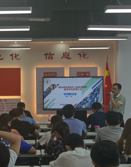 本次培训共分两方面内容:一是对《赣州城市投资控股集团有限责任公司非工程类物资和服务采购管理办法》、《赣州城市投资控股集团有限责任公司非工程类物资和服务采购管理办法》、《赣州城市投资控股集团有限责任公司网络安全事件应急预案(试行)》及《赣州城市投资控股集团有限责任公司资产租赁管理办法》三个制度进行了宣贯;二是特别邀请了中咨江西工程有限公司投资经理卢凯对投后管理进行专题培训授课,主要针对投资监管的三道防线、投资项目投前决策阶段及实施阶段所包含的工作内容、投资项目风险研判以及应对措施、投资项目实施后的效果和效益分析方法进行了全面深入讲解。