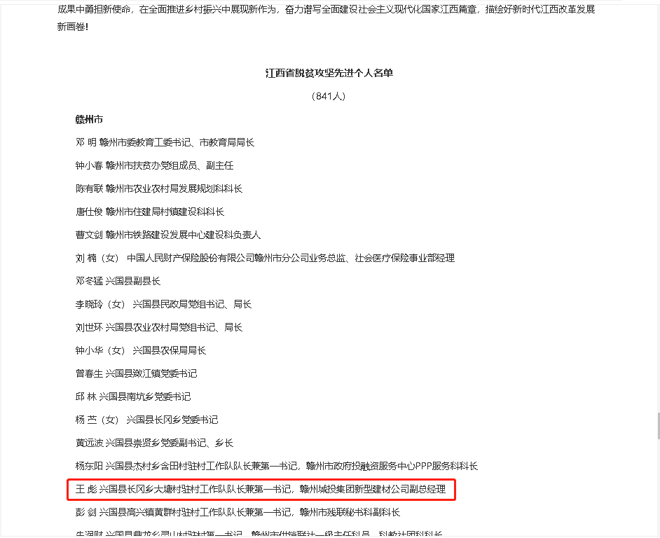 6月23日,省委、省政府召开全省脱贫攻坚总结表彰大会,表彰一批在打赢脱贫攻坚战中作出突出贡献的个人和集体,其中,兴国县长冈乡大塘村驻村工作队队长兼第一书记,赣州城投集团新型建材公司副总经理王彪获“江西省脱贫攻坚先进个人”荣誉称号。