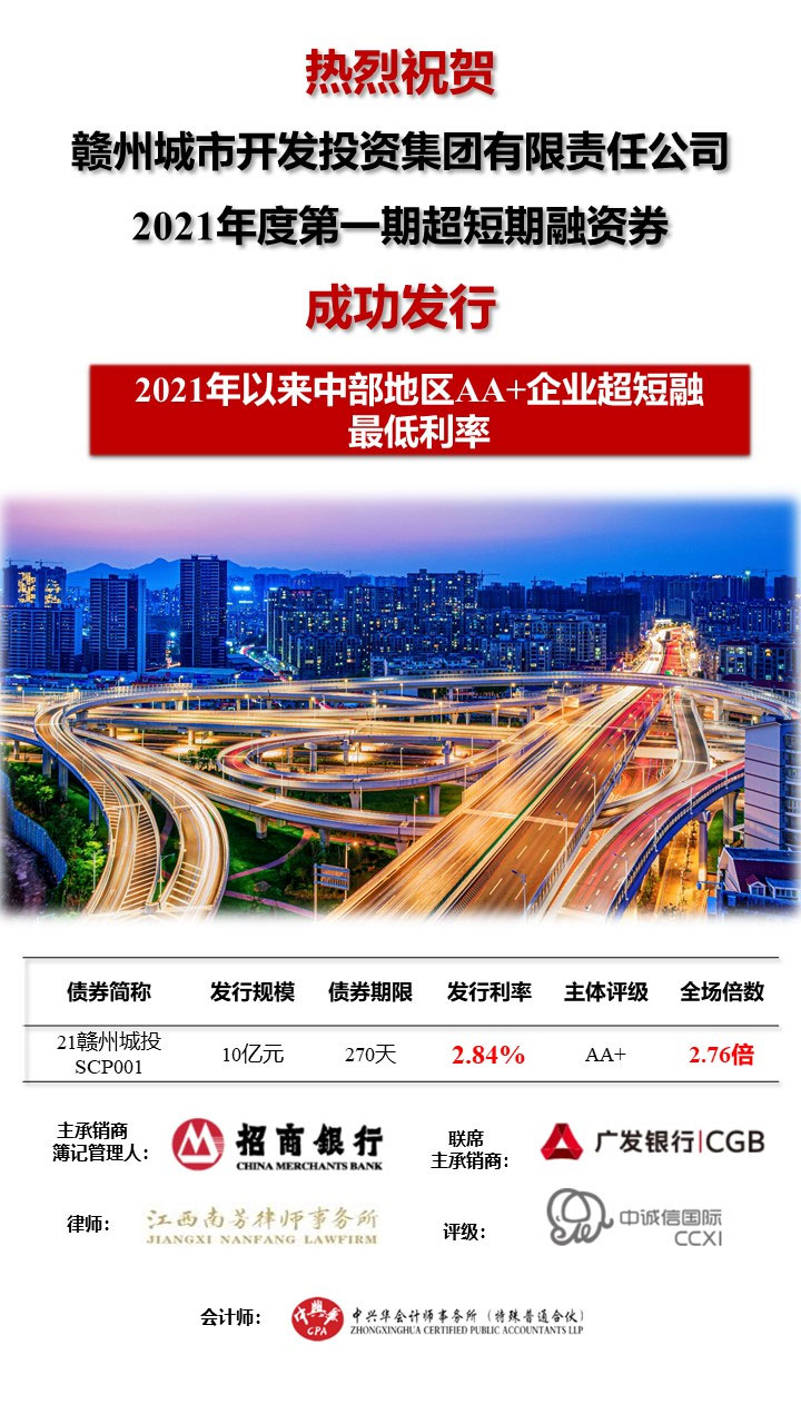 近日,赣州城投集团2021年度第一期超短期融资券(SCP001)在银行间债券市场成功发行,金额10亿元、票面利率2.84%、发行期限270天,全场认购倍数2.76倍,创2021年以来中部地区AA+企业超短融最低利率。