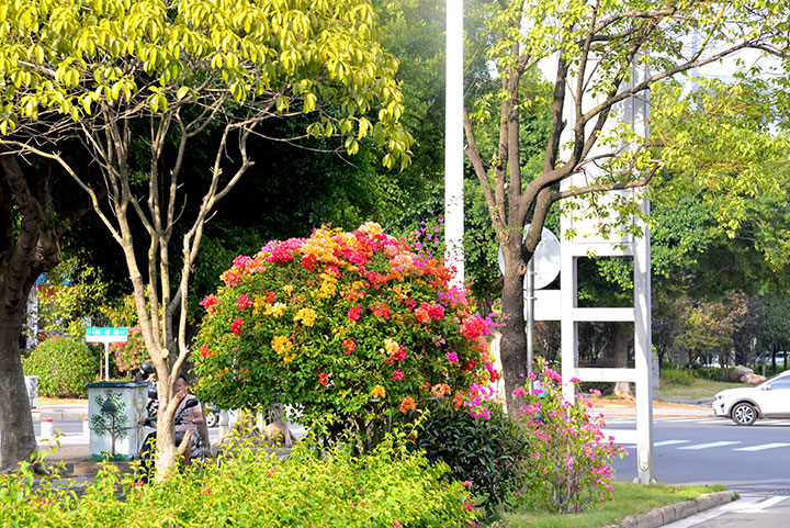 为迎接国庆,赣州生态环境有限公司在市园林环卫管理中心技术人员的指导下利用多种新工艺、新手法、新技术进行控花,以保证三角梅在国庆期间同时绽放,争鲜斗艳。同时,今年在兴国路还种植了五彩三角梅,不同颜色的花朵在一棵三角梅植株上同时开放,吸引了市民们的注意,引来许多市民“打卡”观赏。