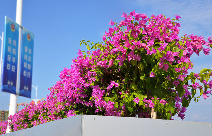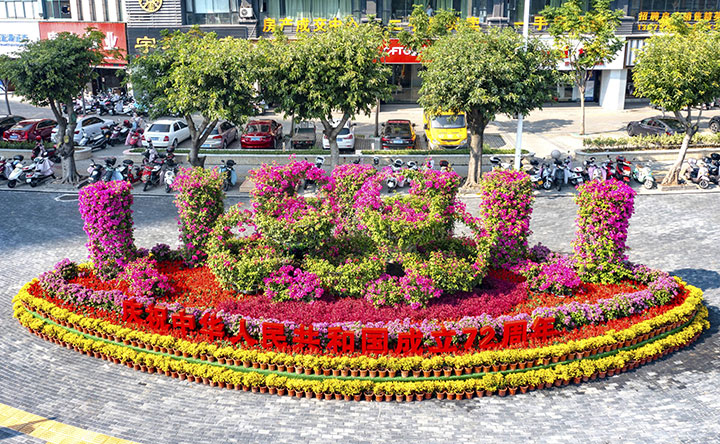赣州城投集团的工作人员介绍,“含蕊红三叶,临风艳一城”三角梅以绝色天姿代表着赣南人民热情、朝气、坚韧不拔和顽强奋进的精神,满城齐放展现对祖国的美好祝愿。