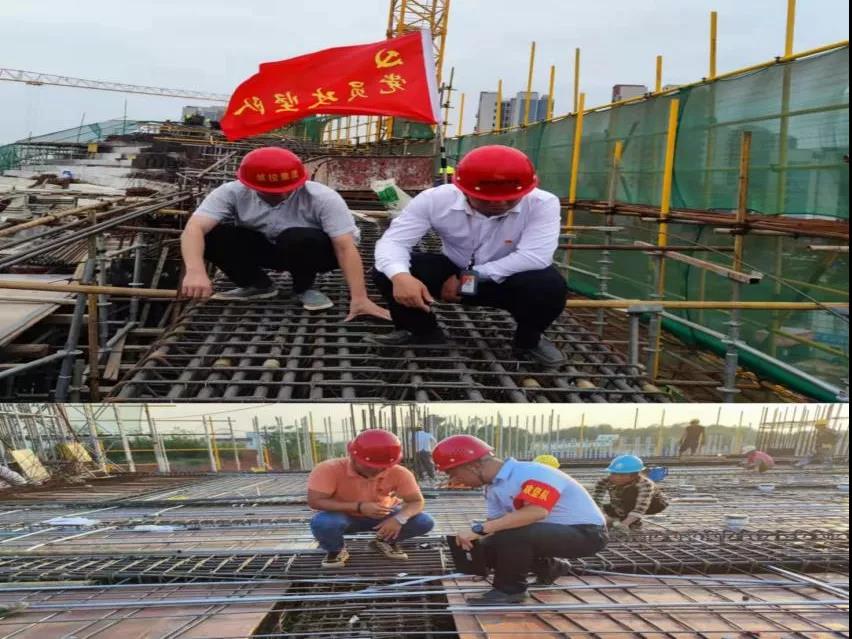 项目部在柱顶环梁模板支撑体系搭设、钢筋绑扎攻坚中,遇到了斜梁钢筋交叉、节点处钢筋极密的特殊情况,同时,柱顶环梁超重超高,且为双曲面结构,施工难度大、定位难度大。为破解这些难题,工程管理公司派驻项目部的党员精心组织各参建单位,积极实施“支部建在项目上、党旗飘在阵地上、党员冲在一线上”的项目党建工作法,在施工过程中,临时联合党支部党员及参建各方全程监督旁站,实现全过程安全、质量管控,达到了预期计划目标。