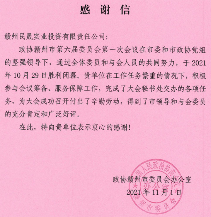 (民晟实业公司收到市人大、市政协的感谢信)